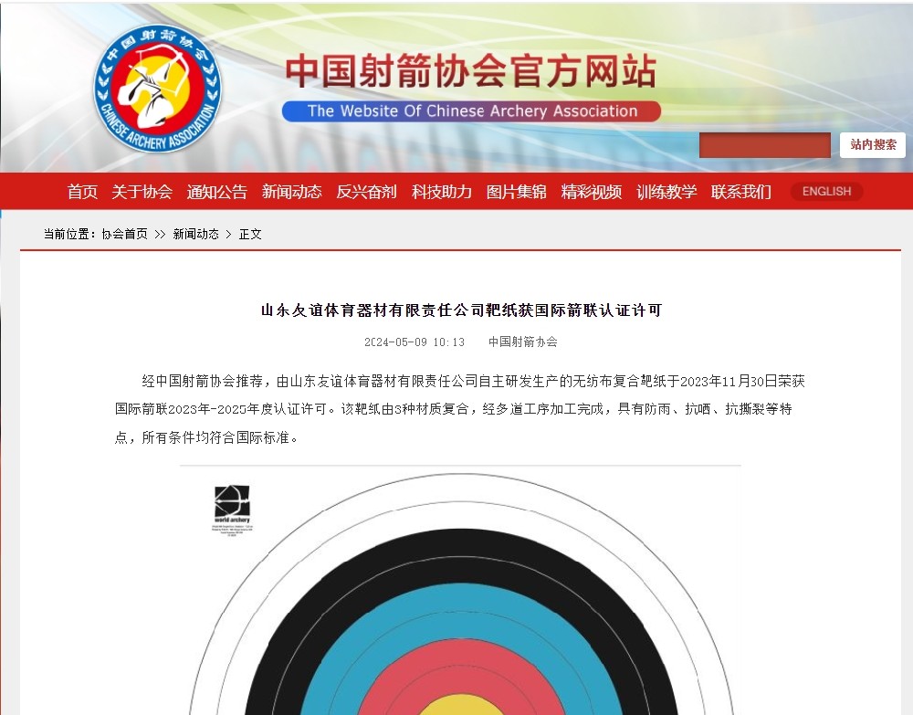 目前,主要生產(chǎn)和銷售射箭比賽及訓(xùn)練專用器材,包括:箭靶、靶紙、靶架、號碼牌、風(fēng)向旗、計時記分器等場地器材設(shè)備;反曲弓、復(fù)合弓、傳統(tǒng)弓、瞄準(zhǔn)器、防震桿等弓箭裝備;箭壺、護胸、護臂、護指等各類箱包護具。公司所生產(chǎn)的射箭器材已通過國際射箭聯(lián)合會及中國射箭協(xié)會CAA認(rèn)證。